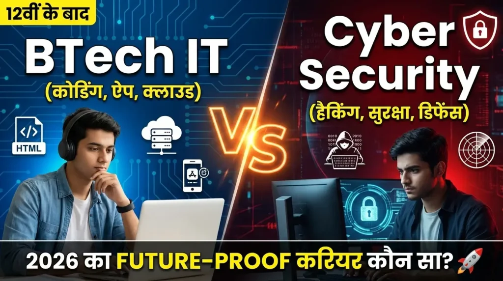 Btech it vs cyber security after 12th: अगर आपने 12वीं पास कर ली है (या करने वाले हैं) और आपके मन में यह सवाल घूम रहा है कि BTech IT करें या Cyber Security, तो आप अकेले नहीं हैं। आज लगभग हर स्टूडेंट यही सोच रहा है कि ऐसा कौन-सा कोर्स चुना जाए जो भविष्य में भी जॉब दे, अच्छी सैलरी मिले और टेक्नोलॉजी बदलने के बाद भी करियर सुरक्षित रहे। 2026 और उसके बाद का दौर पूरी तरह डिजिटल, डेटा-ड्रिवन और सिक्योरिटी-फोकस्ड होने वाला है। ऐसे में IT और Cyber Security दोनों ही कोर्स चर्चा में हैं, लेकिन दोनों का रास्ता और काम करने का तरीका अलग-अलग है।